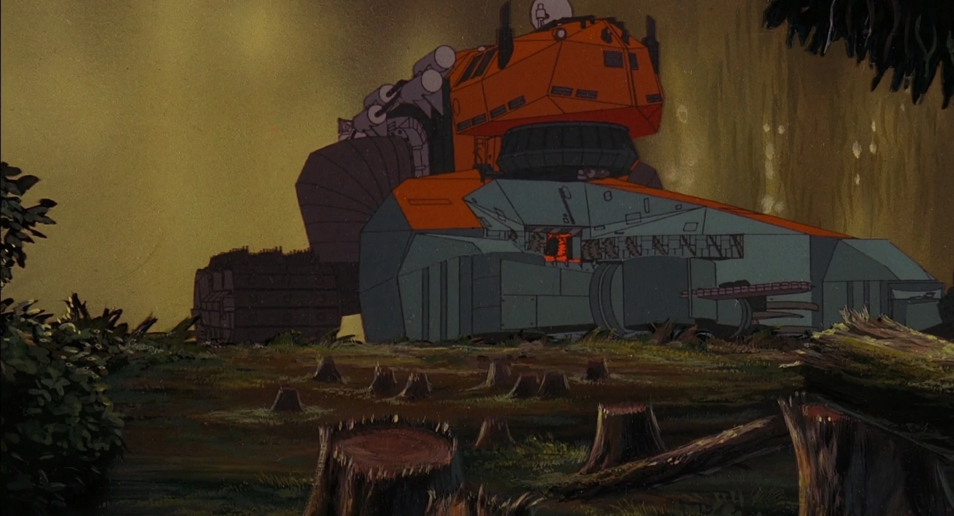 The Leveler is a large mobile lumber harvester, acting as a mobile lumber mill. It has a pair of extendable arms with long saw blades on each wrist. The hands are used to grab onto trees and cut branches with its sharp fingers-like claws. It is driven by a powerful diesel engine allowing it to operate efficiently. It moves on a pair of spiked treads which give effective traction in the woods. The center of this platform is the harvester unit, a series of saw blades which shave the bark off trees and process the lumber into boards. The interior has a break room, the drivers cabin, and the lumber mill warehouse.
