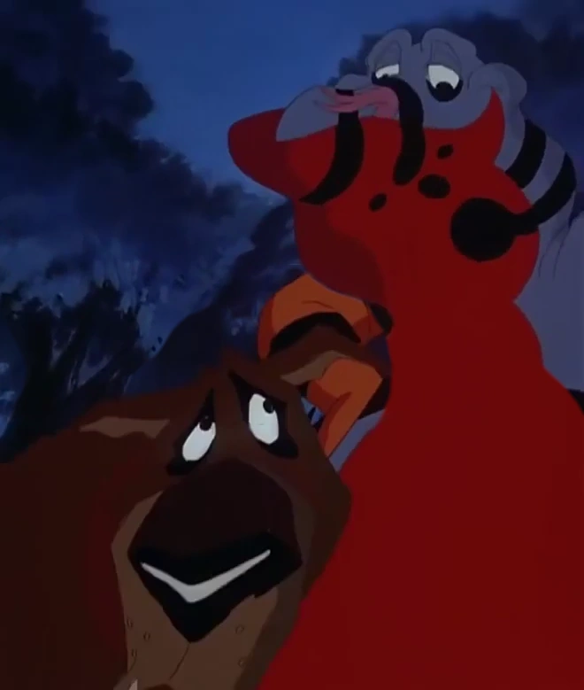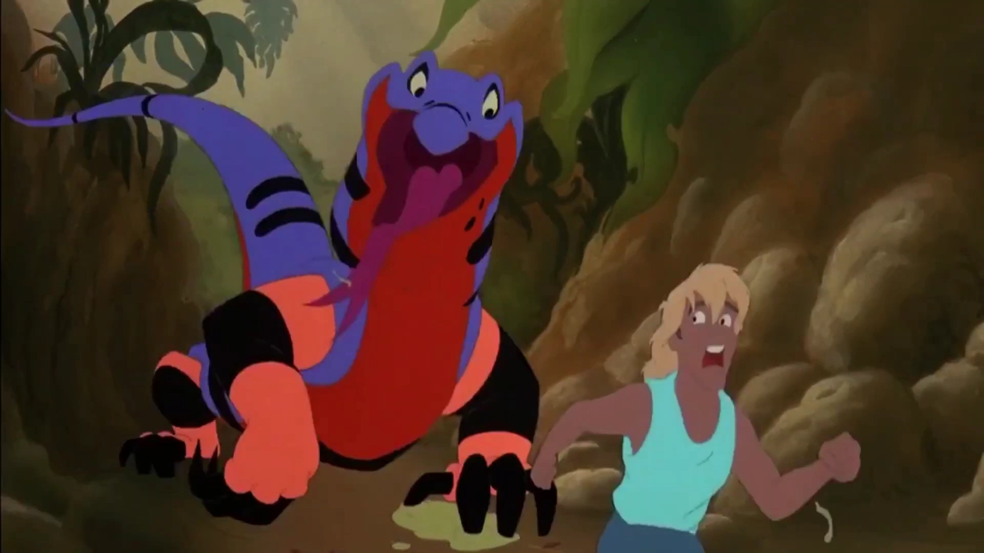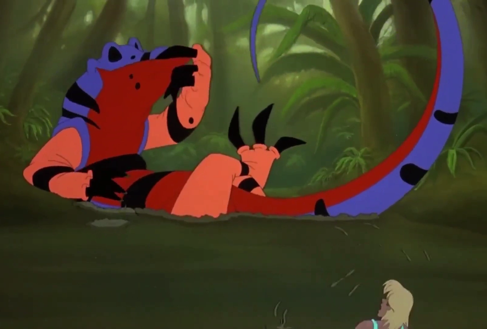 Zak panics and just puts a leaf over his head, knees knocking. Lou picks him up leaf and all, and teases that he'll eat him like a sandwich. Zak slips free from the leaf, but falls into the nearby river, barely able to swim away from Lou's claw trying to grab him. Instead of swimming after him, Lou stays on land relaxing with his legs crossed, slurping water off his claw like Zak being in it made it "some exotic stew". Zak is carried down the river, which turns out to be full of leeches who join in Lou's song taunting him, and also want to eat him. They corner him against a bank that's next to a cliff, and he falls off.